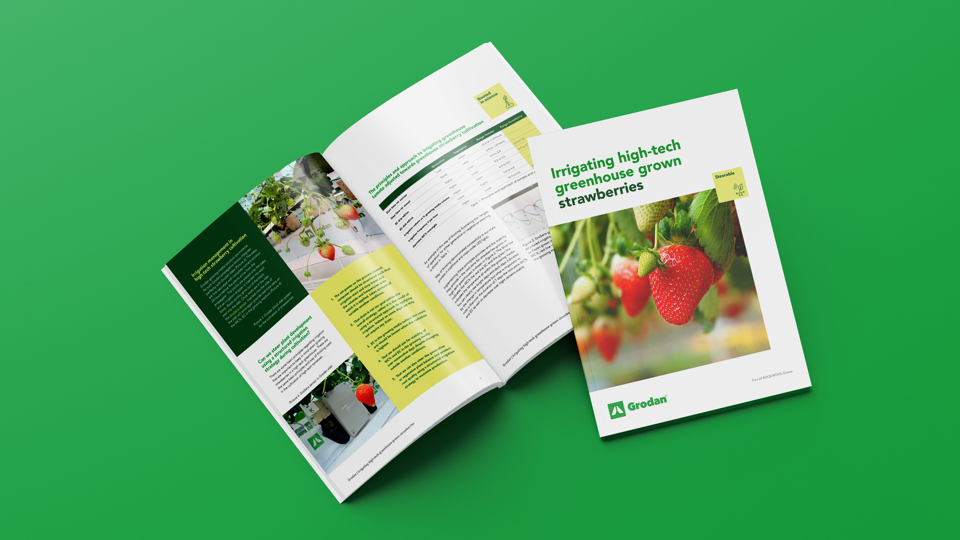 This article explores innovative irrigation techniques for high-tech indoor strawberry cultivation using Grodan stone wool growing media. By leveraging its steerability, growers can precisely control water content (WC%) and electrical conductivity (EC), enhancing young plant quality and yields. Ebb-flood irrigation systems in hydroponic strawberry propagation maintain dry crowns, minimising Phytophthora infections. A strategic irrigation strategy promotes robust root systems. In cultivation, Grodan offers blocks, slabs, facilitating real-time monitoring the root zone management via GroSens sensors. Read more in this article.